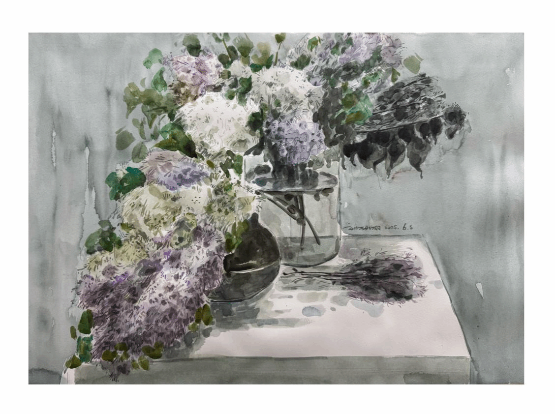 教师刘湘入选作品《景物写生-丁香花》水彩画