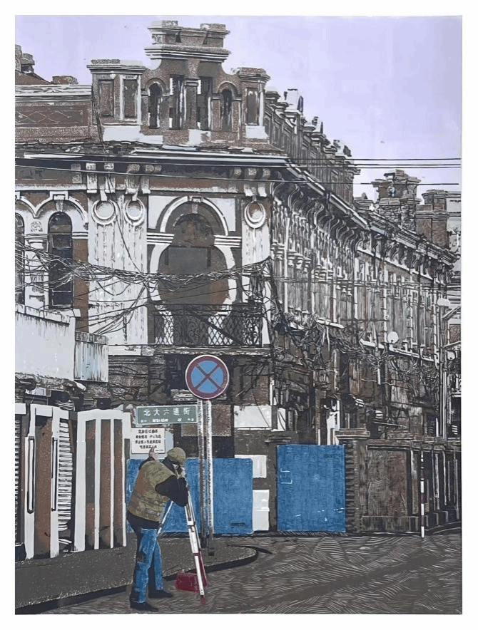 学生获银奖作品《老道外的时光雕痕》套色木刻版画